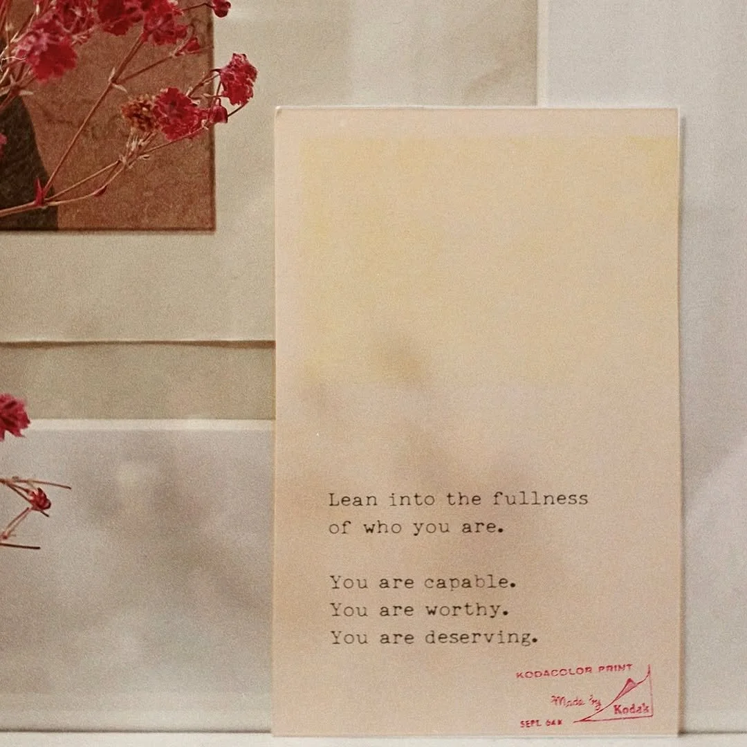 Affirmation (Mirror Work Deck, 2021): Lean into the fullness of who you are. You are capable. You are worthy. You are deserving.” - Jiya Pinder